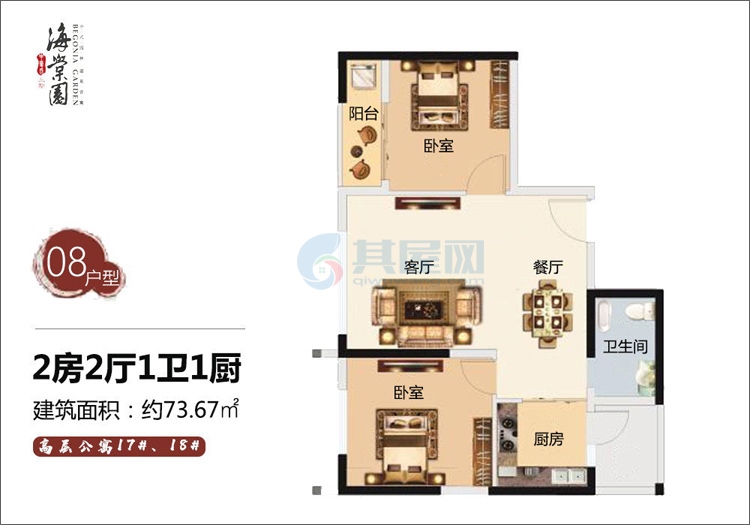 三期08户型-建面约73.67㎡-2房2厅1厨1卫