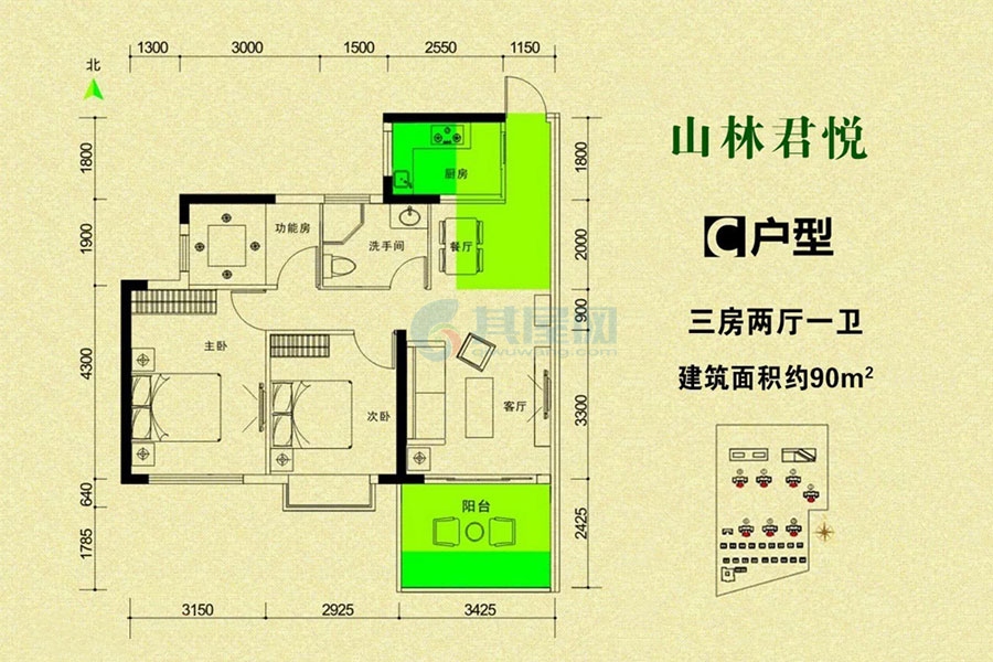 C户型约90平米(建筑面积)三房二厅(建筑面积:90㎡)