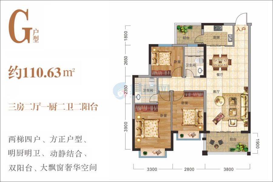 G户型-建面约110.63㎡-三房两厅一厨两卫双阳台(建筑面积:110.63㎡)