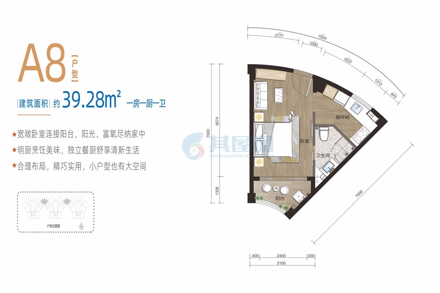 A8户型-约39.28㎡- 1房1厅1厨1卫(建筑面积:39.28㎡)
