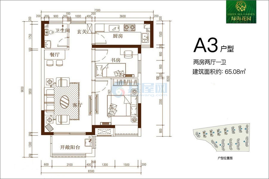 A3户型-建面约65.08㎡-两房两厅一卫(建筑面积:65.08㎡)