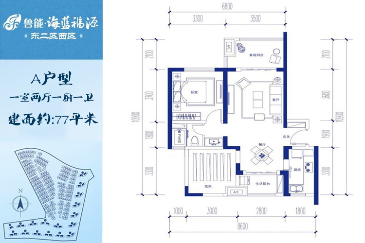 鲁能海蓝福源共分为东区、西区、南区三个片区。目前在售的为东二区西区建面约74-130平米的瞰海精装公寓,以及建面约93-120平米玲珑微墅。