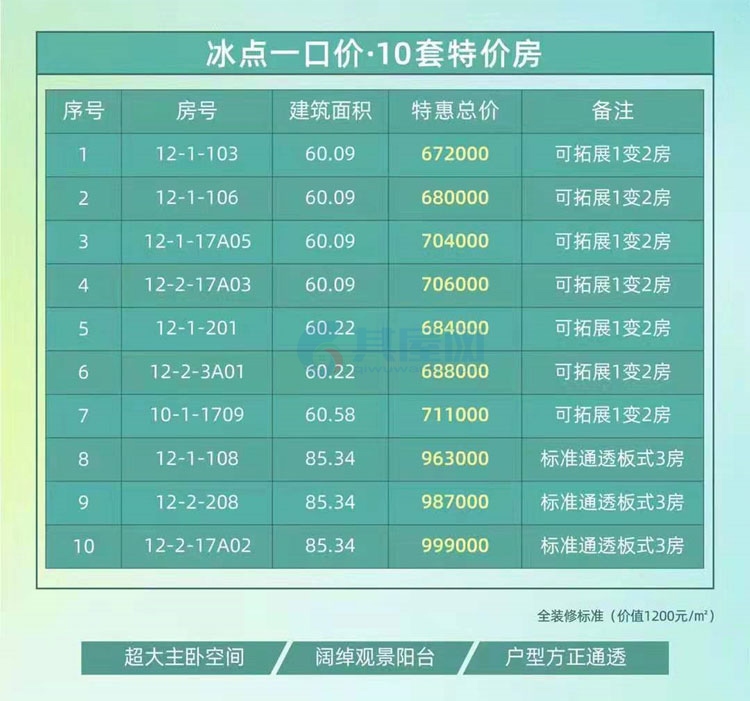 目前在售二期:建面约60.16㎡一房,朝南/朝北,可拓展成两房(实得面积约72㎡);建面约85.36㎡板式三房,南北通透(实得面积约92㎡);总价67.5万/套起,带装修!